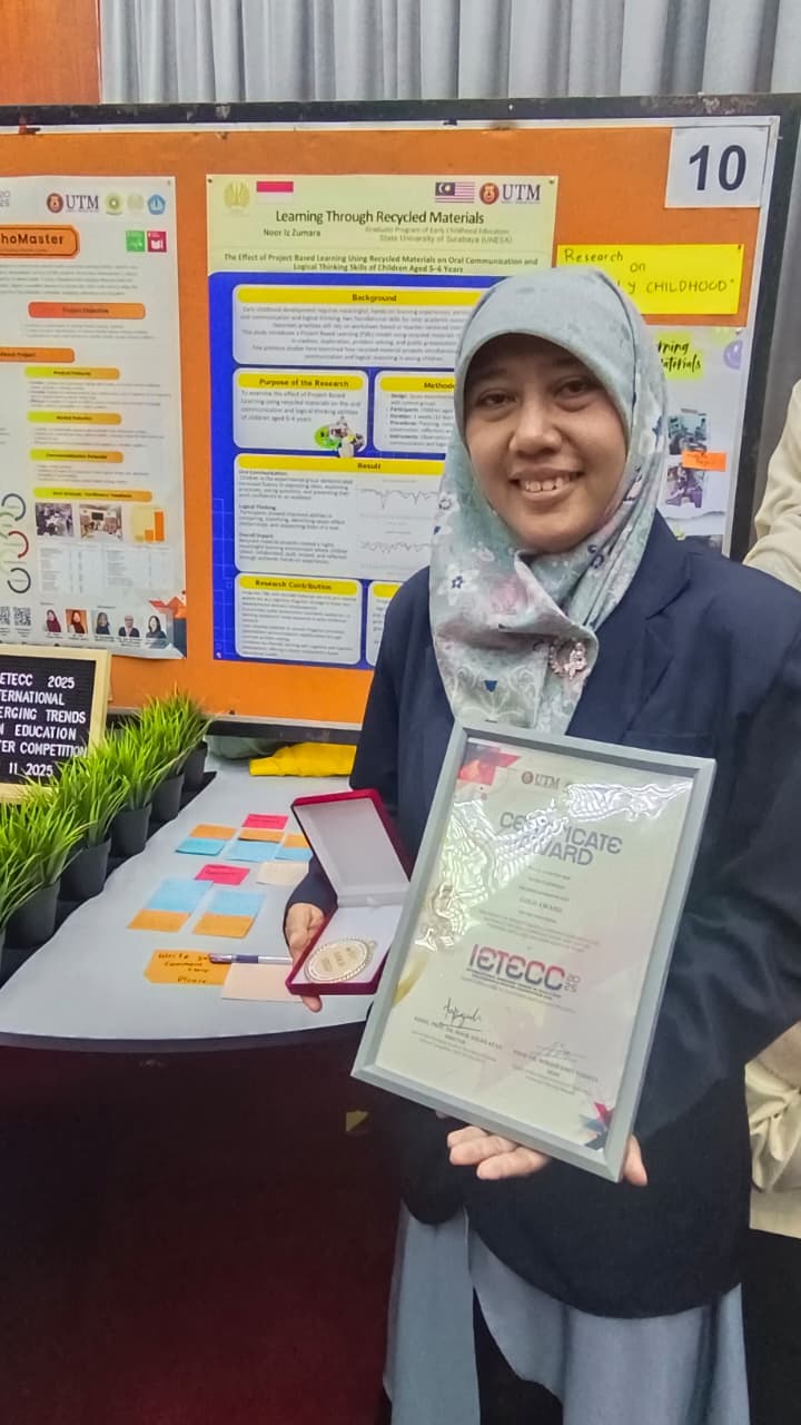 Kepala KBTK Al Hikmah Surabaya, Ibu Noor Iz Zumara,S.Psi. berhasil meraih medali emas dalam event International Emerging Trends In Education Colloquium and Poster Competition 2025 (IETECC) dengan tema “Creative Innovation for Sustainable and Education. Kegiatan ini dilaksanakan pada Senin, 01 Desember 2025 di Universiti Teknologi Malaysia (UTM), Kuala Lumpur.